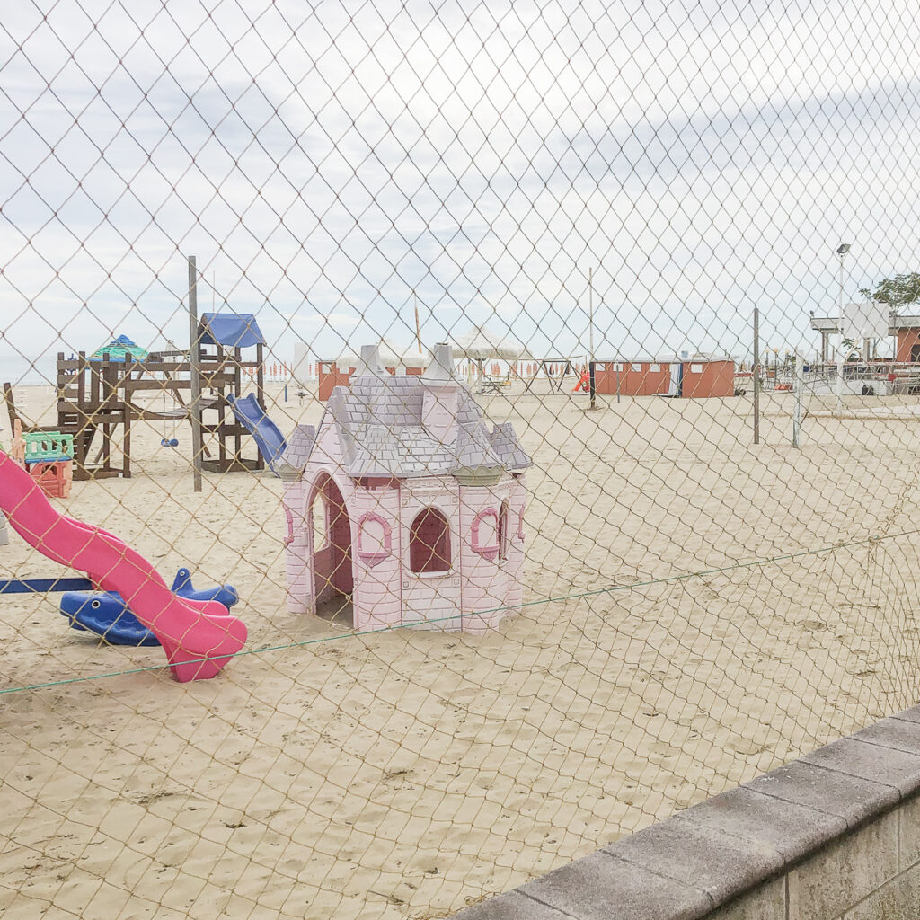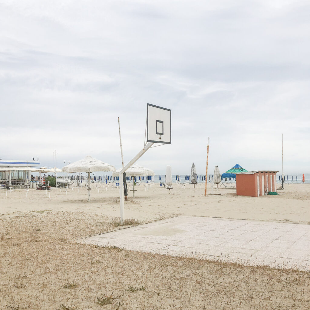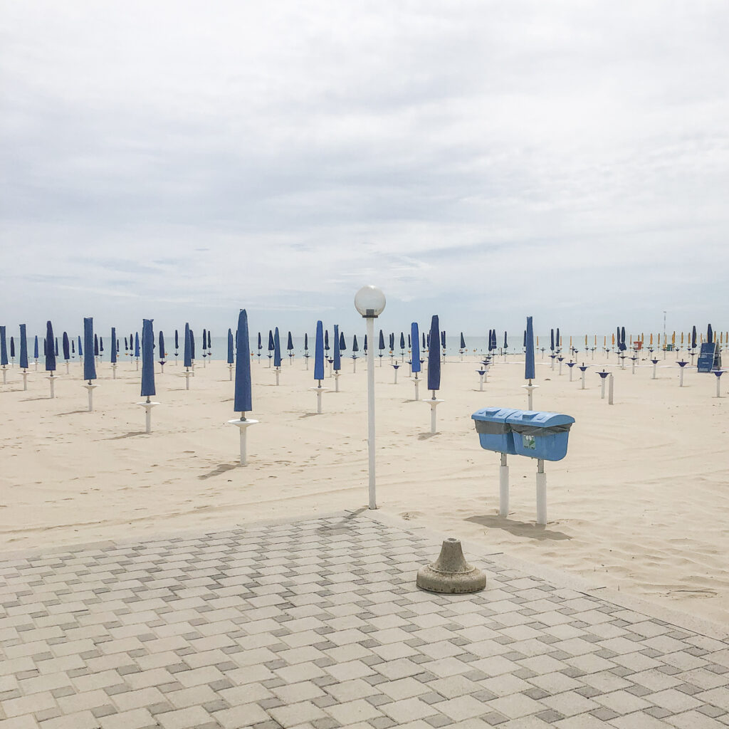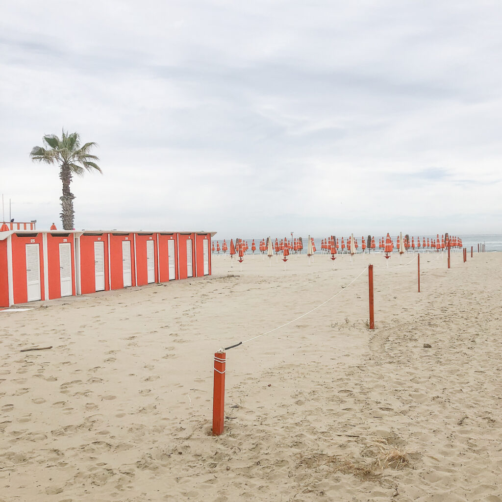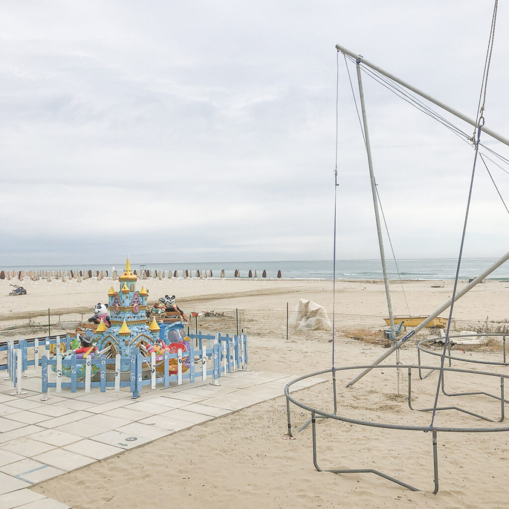 Nelle spiagge ancora desolate spuntano improvvise tracce di presenza umana, ombrelloni come funghi di stagione e giochi colorati.